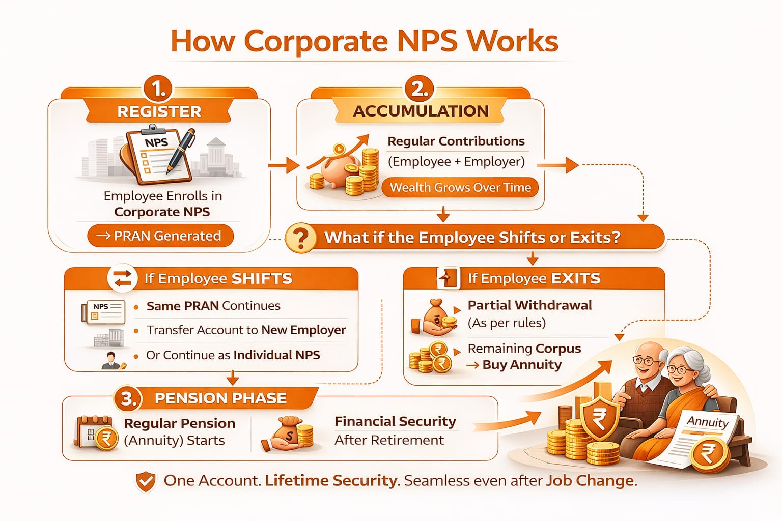 NPS Corporate Model is designed for companies, PSUs, and other organizations to offer NPS to their employees through the employer. It helps employees build a retirement corpus while enjoying tax benefits and long-term financial security.