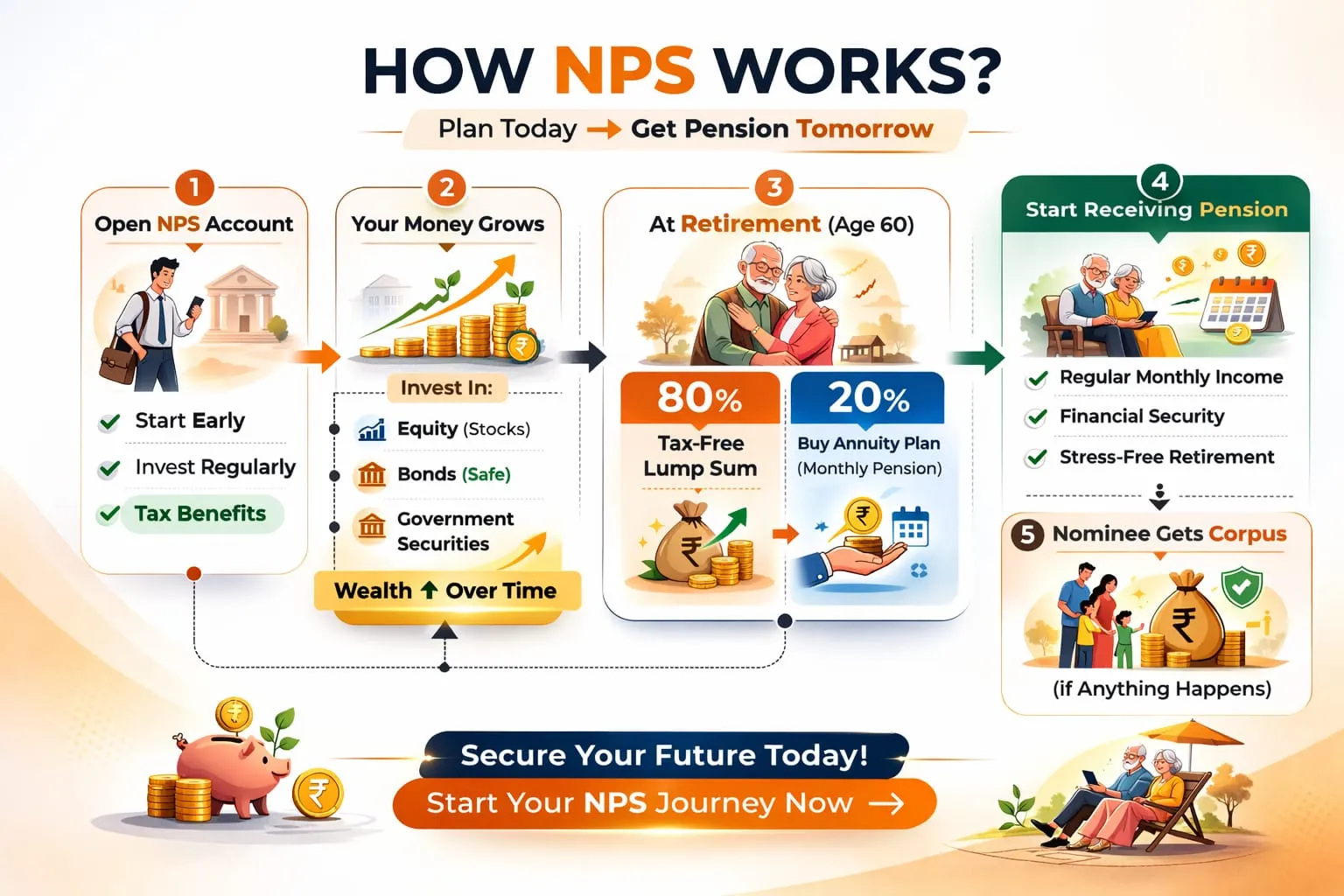 NPS is a market-linked pension scheme regulated by PFRDA and supported by the Government of India. It allows you to invest regularly during your working years and receive a lump sum + monthly pension after retirement.